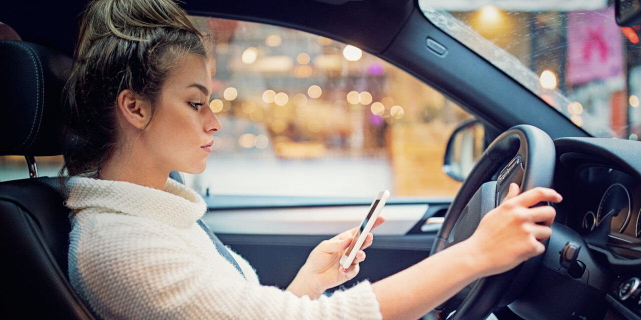 Young girl is texting in the traffic jam